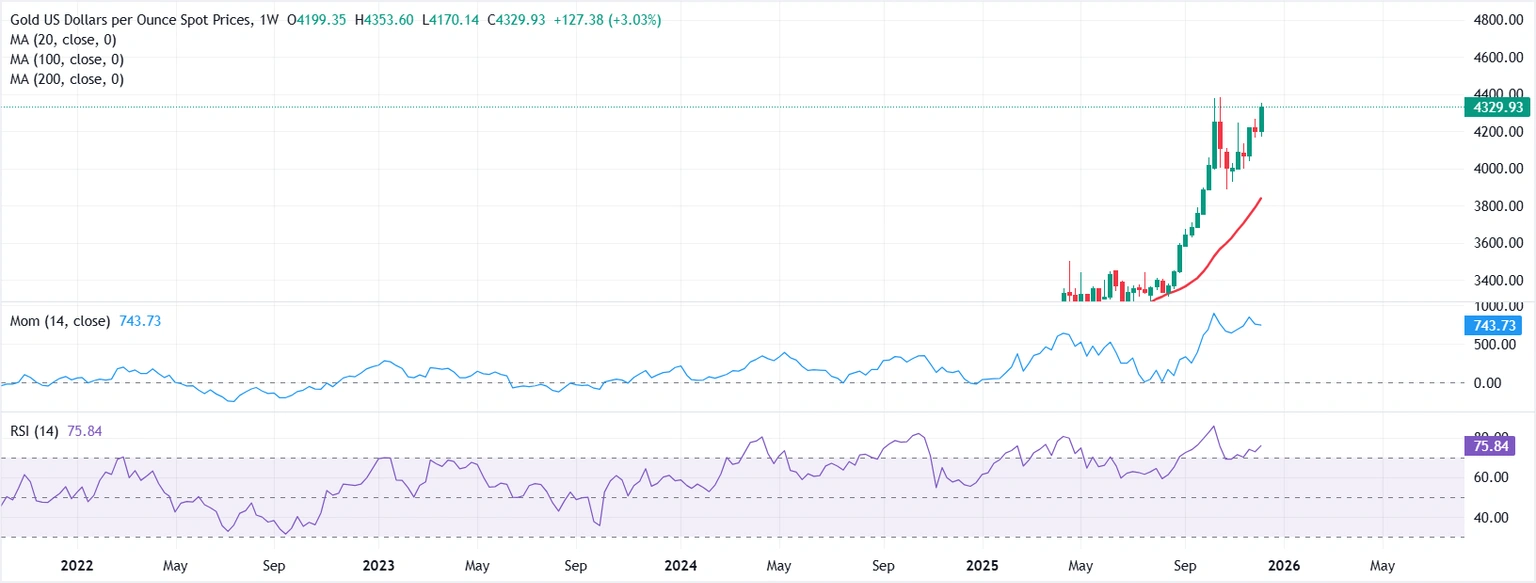 Giá vàng đã tăng khoảng 3% trong tuần, dao động quanh mốc 4.350 USD vào thứ Sáu, và cuối cùng ổn định ở mức khoảng 4.330 USD. Mặc dù được coi là tài sản trú ẩn an toàn, kim loại quý này vẫn tăng giá trong bối cảnh thị trường ưa rủi ro, giữa lúc đồng đô la Mỹ (USD) suy yếu trên diện rộng.