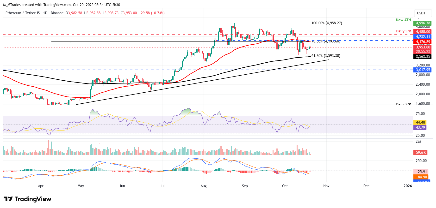 Giá Ethereum đã điều chỉnh hơn 4% vào tuần trước sau khi bị từ chối khỏi ngưỡng kháng cự hàng ngày ở mức 4.232 đô la. Vào đầu tuần này , thứ Hai, giá dao động quanh mức 3.953 đô la.