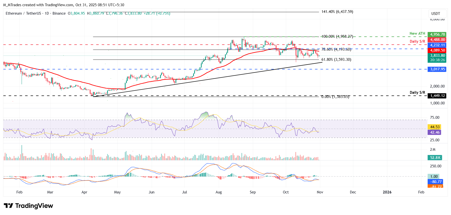 Giá Ethereum đã bị từ chối khỏi ngưỡng kháng cự hàng ngày ở mức 4.232 đô la vào thứ Hai và giảm 8,86% vào thứ Năm. Tại thời điểm viết bài vào thứ Sáu, ETH dao động quanh mức 3.833 đô la.