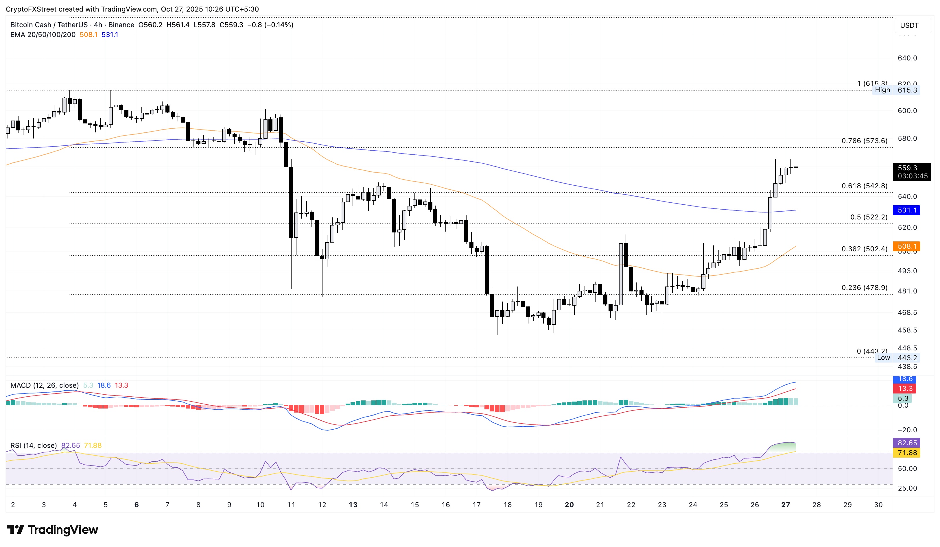 Khi sự quan tâm của cá voi tăng lên, một đợt tăng giá thành công trên mức 573 đô la có thể kéo dài đà tăng giá của BCH lên mức đỉnh 615 đô la vào ngày 3 tháng 10.