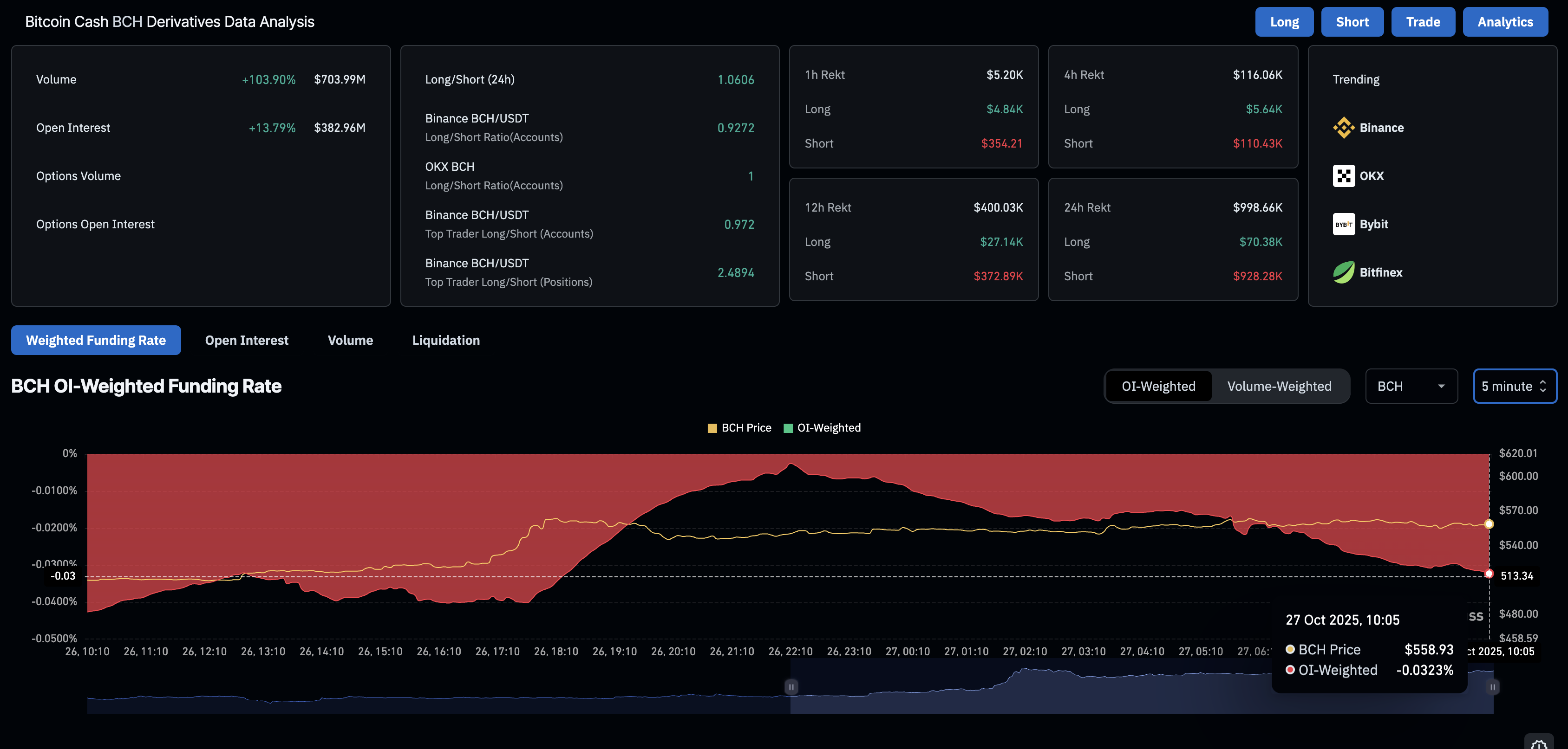 Phù hợp với nhu cầu cao, dữ liệu của CoinGlass cho thấy Khối lượng mở (OI) hợp đồng tương lai BCH đã tăng 13,8% trong 24 giờ qua, đạt 382,96 triệu đô la. Sự gia tăng OI hợp đồng tương lai cho thấy tâm lý chấp nhận rủi ro của các nhà giao dịch khi giá trị danh nghĩa của các vị thế mua đang tăng lên.