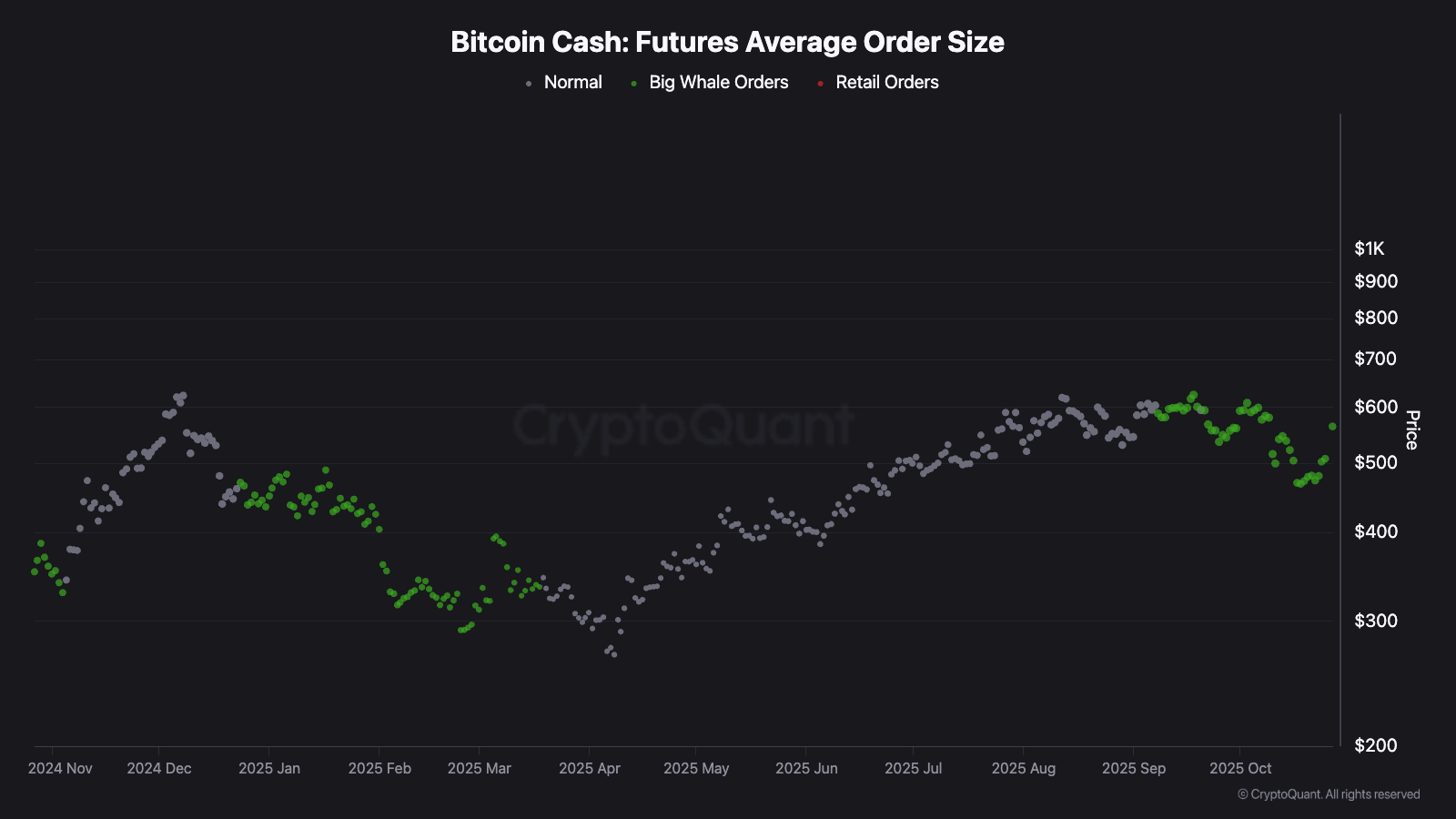 Thị trường phái sinh chứng kiến nhu cầu Bitcoin Cash tăng vọt khi các nhà giao dịch tận dụng sự thay đổi đột ngột trong tâm lý thị trường. Dữ liệu từ CryptoQuant cho thấy các nhà giao dịch giàu có, thường được gọi là cá voi, đang đặt lệnh lớn vào hợp đồng tương lai Bitcoin Cash. Thông thường, sự gia tăng hoạt động của cá voi trên thị trường tương lai báo hiệu một đợt tăng giá.