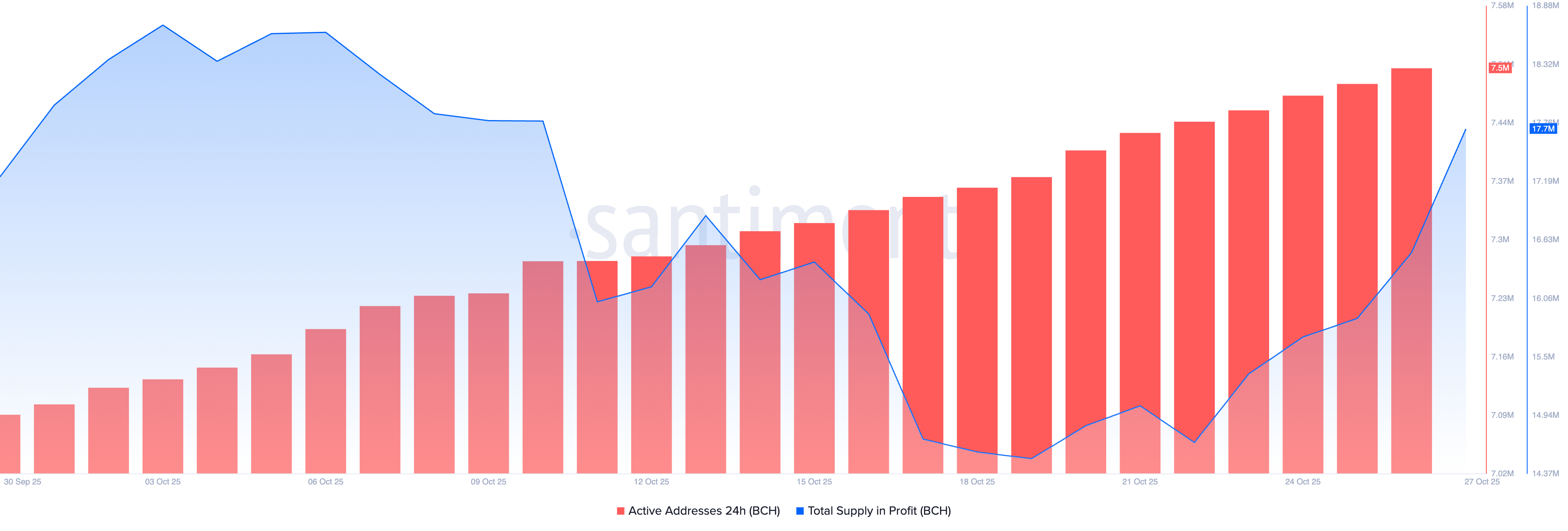 Địa chỉ hoạt động và nguồn cung Bitcoin Cash đang có lợi nhuận. Nguồn: Santiment.