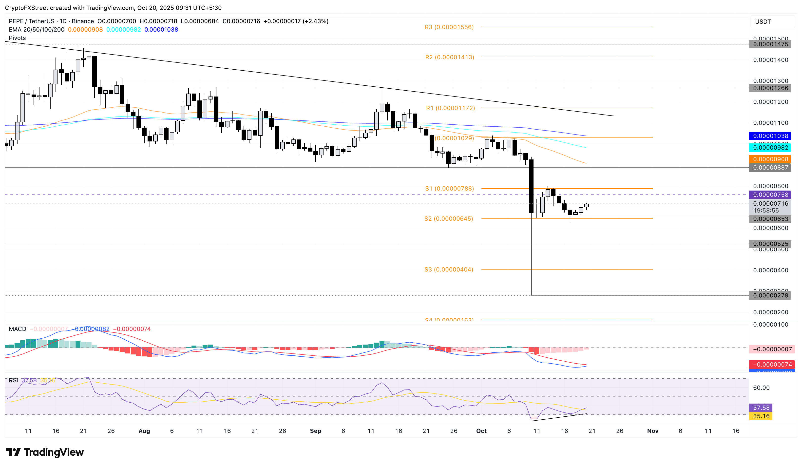 Các chỉ báo kỹ thuật trên biểu đồ hàng ngày cho thấy áp lực bán đang giảm dần khi tín hiệu phân kỳ tăng giá RSI liên tục cũng được thấy ở PEPE. Chỉ báo RSI hiện ở mức 37, đang tăng lên về phía đường giữa. Hơn nữa, đường MACD đang tiến gần hơn đến đường tín hiệu, nơi một sự giao cắt có thể xác nhận xu hướng tăng giá mới.
