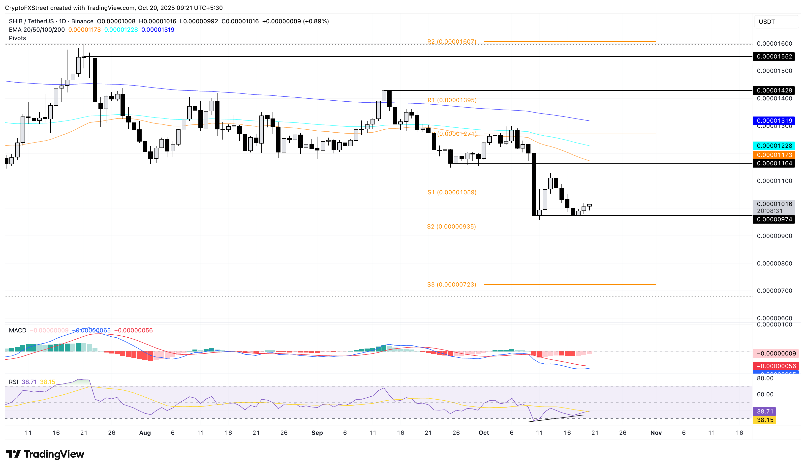 Các chỉ báo động lượng trên biểu đồ hàng ngày cho thấy áp lực bán đang giảm khi đường MACD đang phục hồi tiến gần đến đường tín hiệu, chuẩn bị cho một cú giao cắt tiềm năng. Đồng thời, chỉ báo RSI ở mức 38 cho thấy xu hướng tăng từ vùng quá bán, trong khi SHIB đã kiểm tra lại ngưỡng hỗ trợ 0,00000974 đô la, đánh dấu một phân kỳ tăng giá.