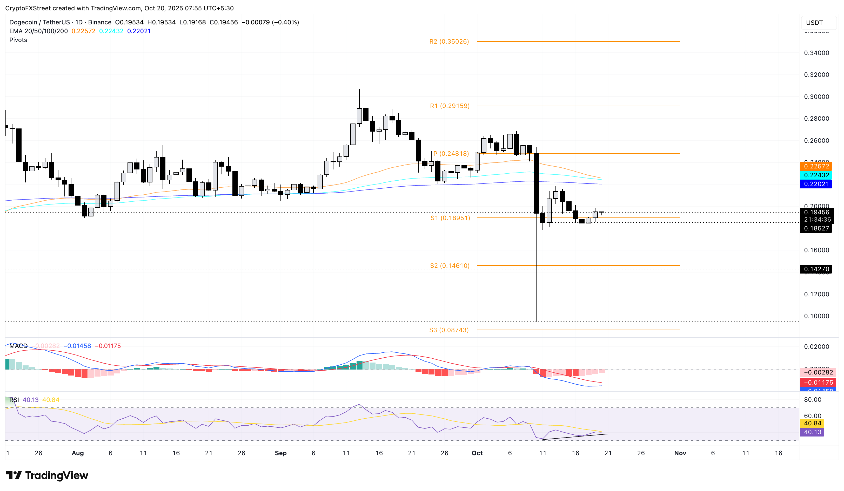 Giá Dogecoin vẫn giữ vững trên mức 0,19000 đô la vào thời điểm viết bài hôm thứ Hai, sau khi tăng 5% từ hai ngày phục hồi liên tiếp. Đồng tiền meme này đang tiến gần đến ngưỡng tâm lý 0,20000 đô la sau khi bật lên từ ngưỡng hỗ trợ 0,18527 đô la được hình thành vào ngày 11 tháng 10.
