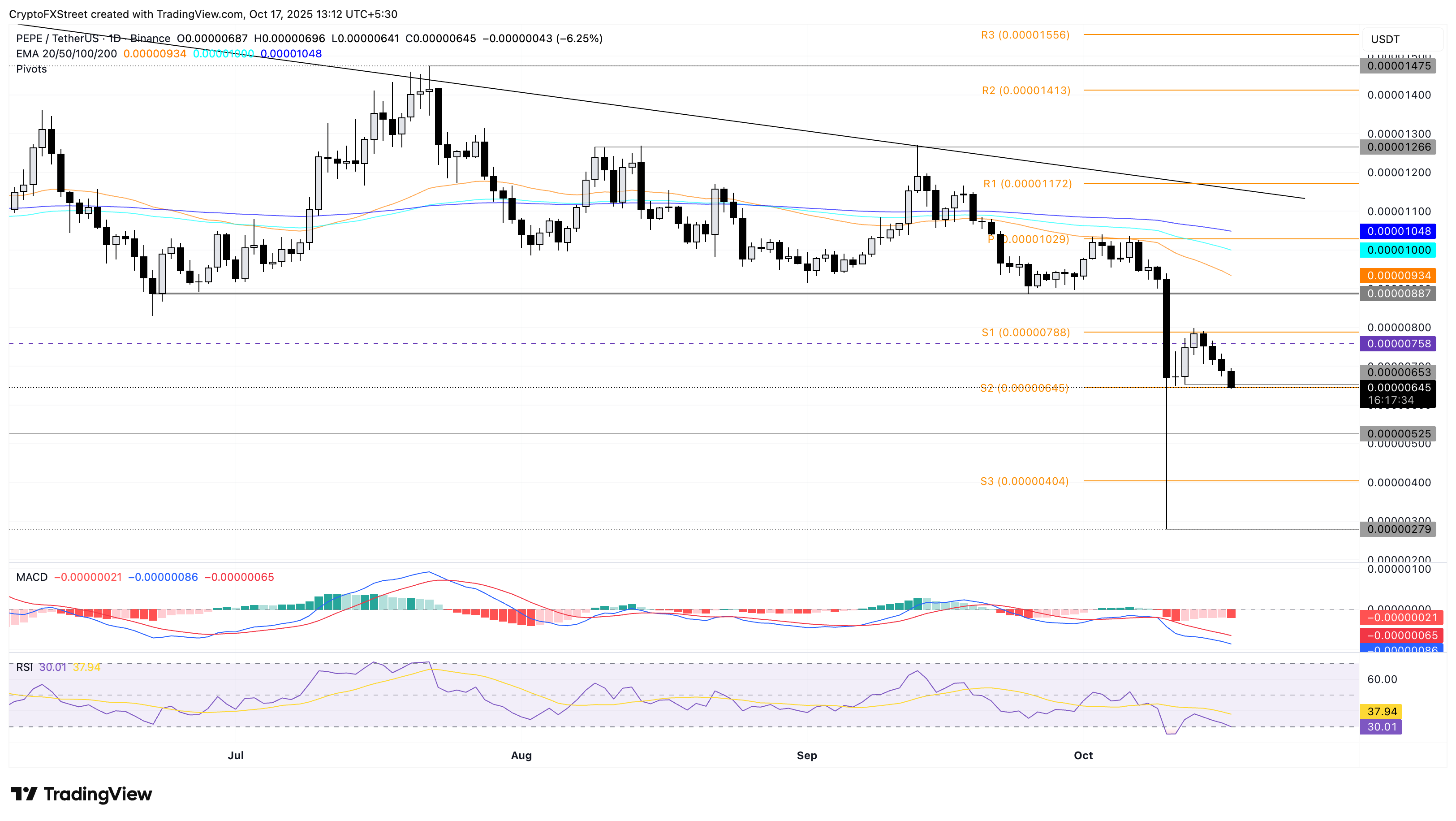Pepe đã giảm hơn 6% vào thời điểm viết bài hôm thứ Sáu, đánh dấu một cuối tuần ảm đạm sắp tới. Đồng tiền meme mang chủ đề con ếch này đang kiểm tra mức Pivot Point S2, đóng vai trò là ngưỡng hỗ trợ tức thời, ở mức 0,00000645 đô la.