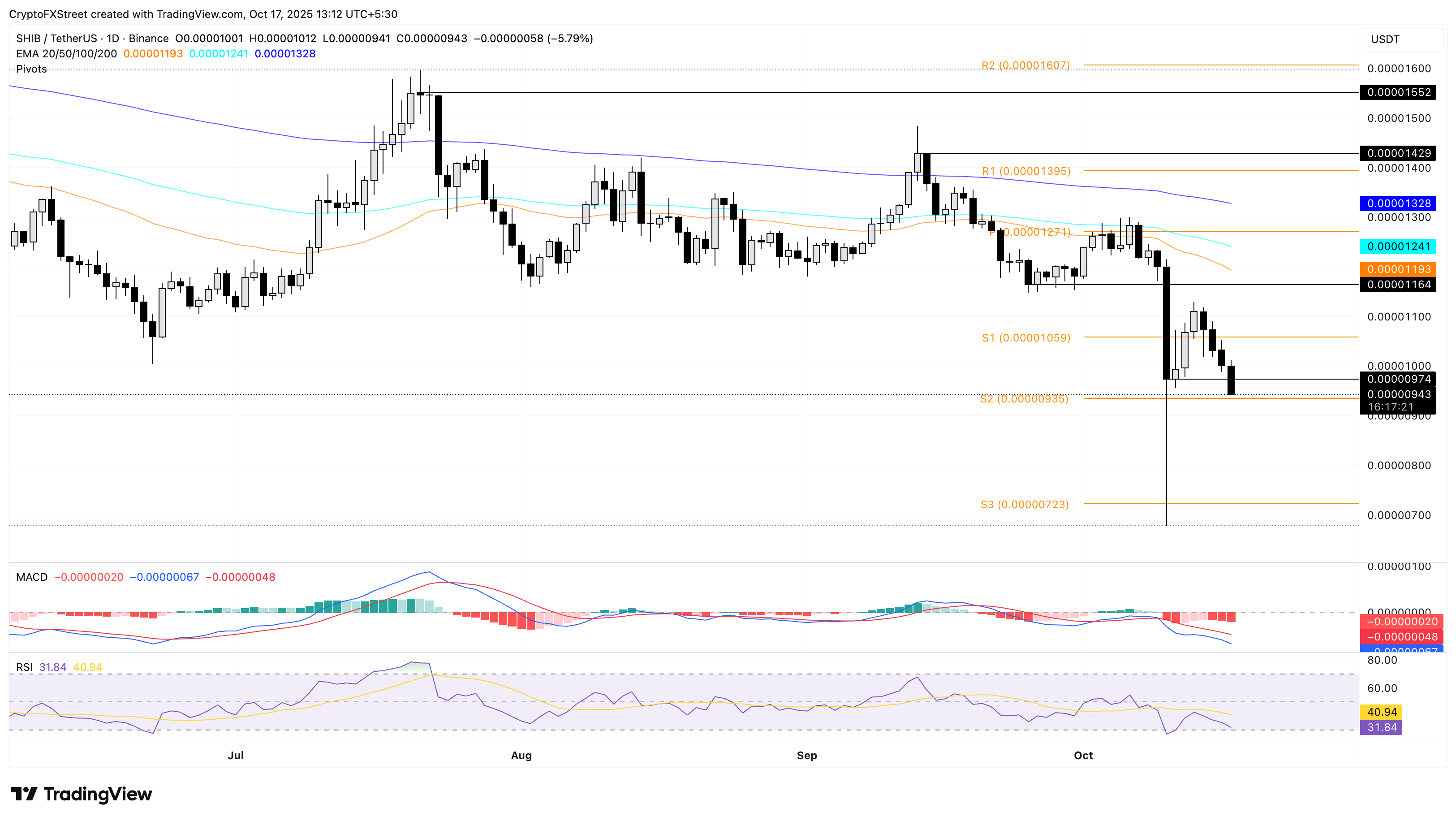 - Shiba Inu chịu áp lực bán lớn đã phá vỡ mức hỗ trợ tâm lý 0,00001000 đô la.