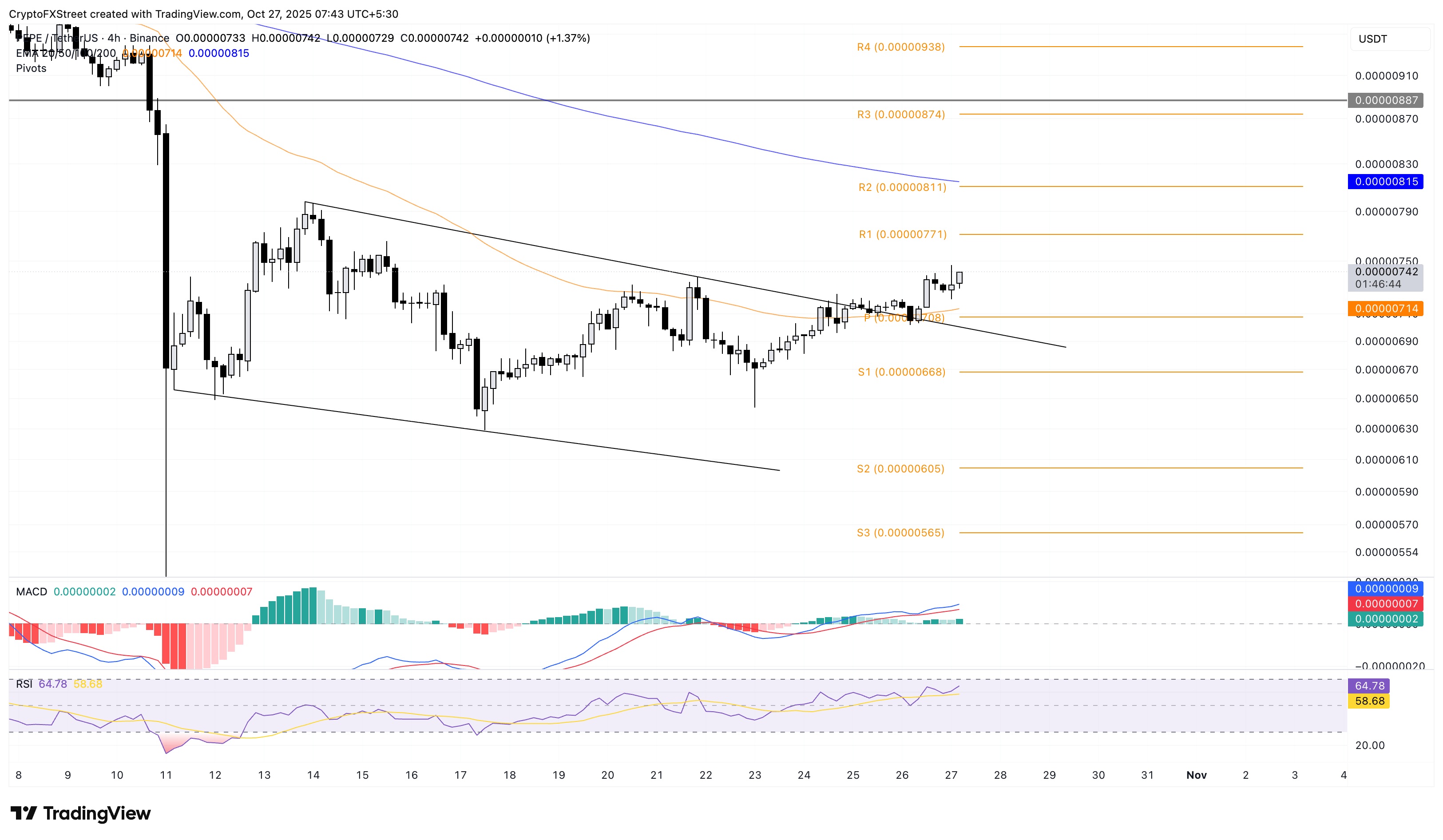Về mặt tiêu cực, đường EMA 50 kỳ ở mức 0,00000714 đô la vẫn là mức hỗ trợ quan trọng đối với PEPE, tiếp theo là Điểm trục S1 ở mức 0,00000668 đô la.