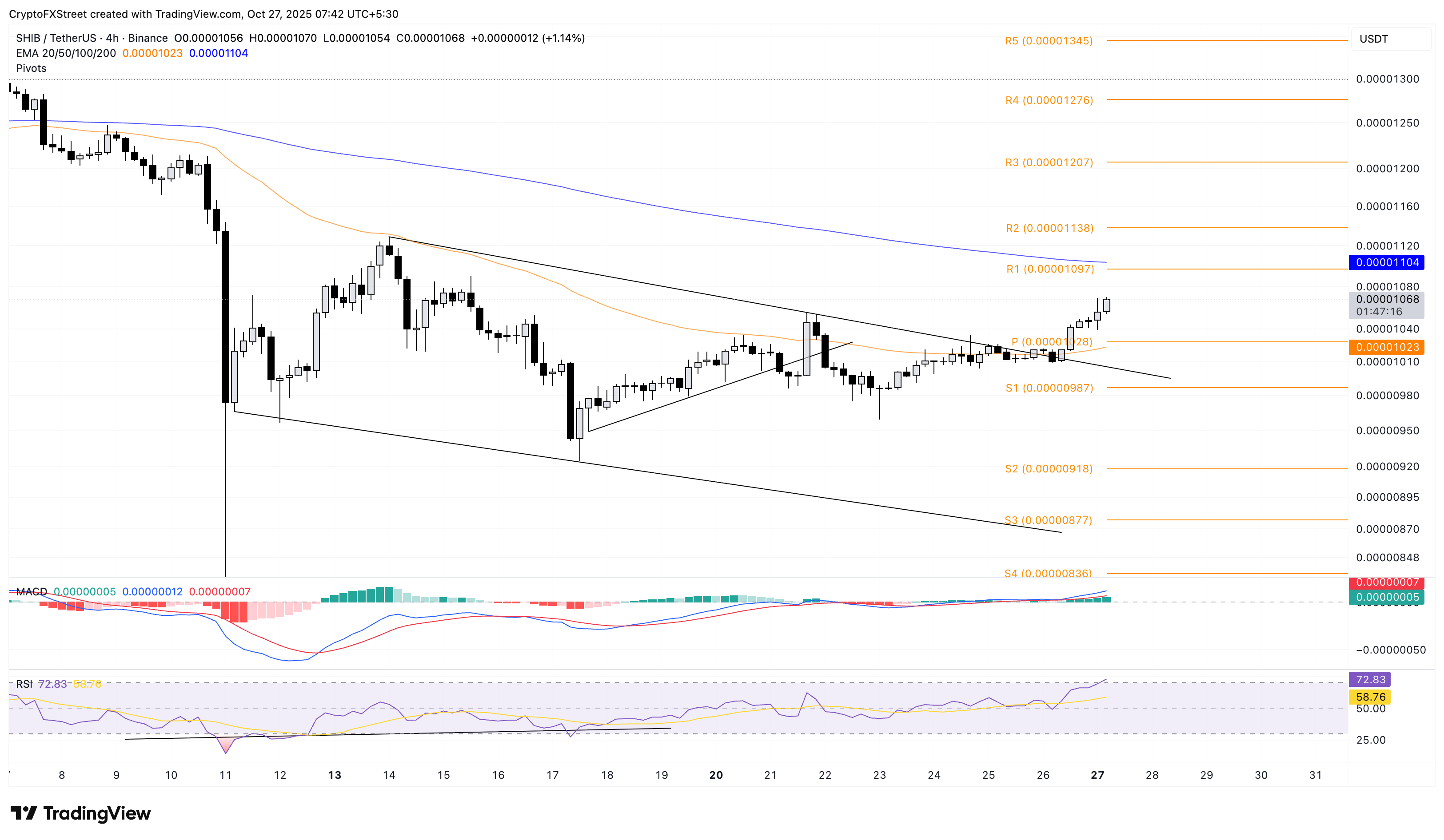 Một mức đóng cửa quyết định trên mức này sẽ đưa Điểm trục R2 và R3 lần lượt ở mức 0,00001138 đô la và 0,00001207 đô la vào tầm ngắm của những người đầu cơ giá lên SHIB.