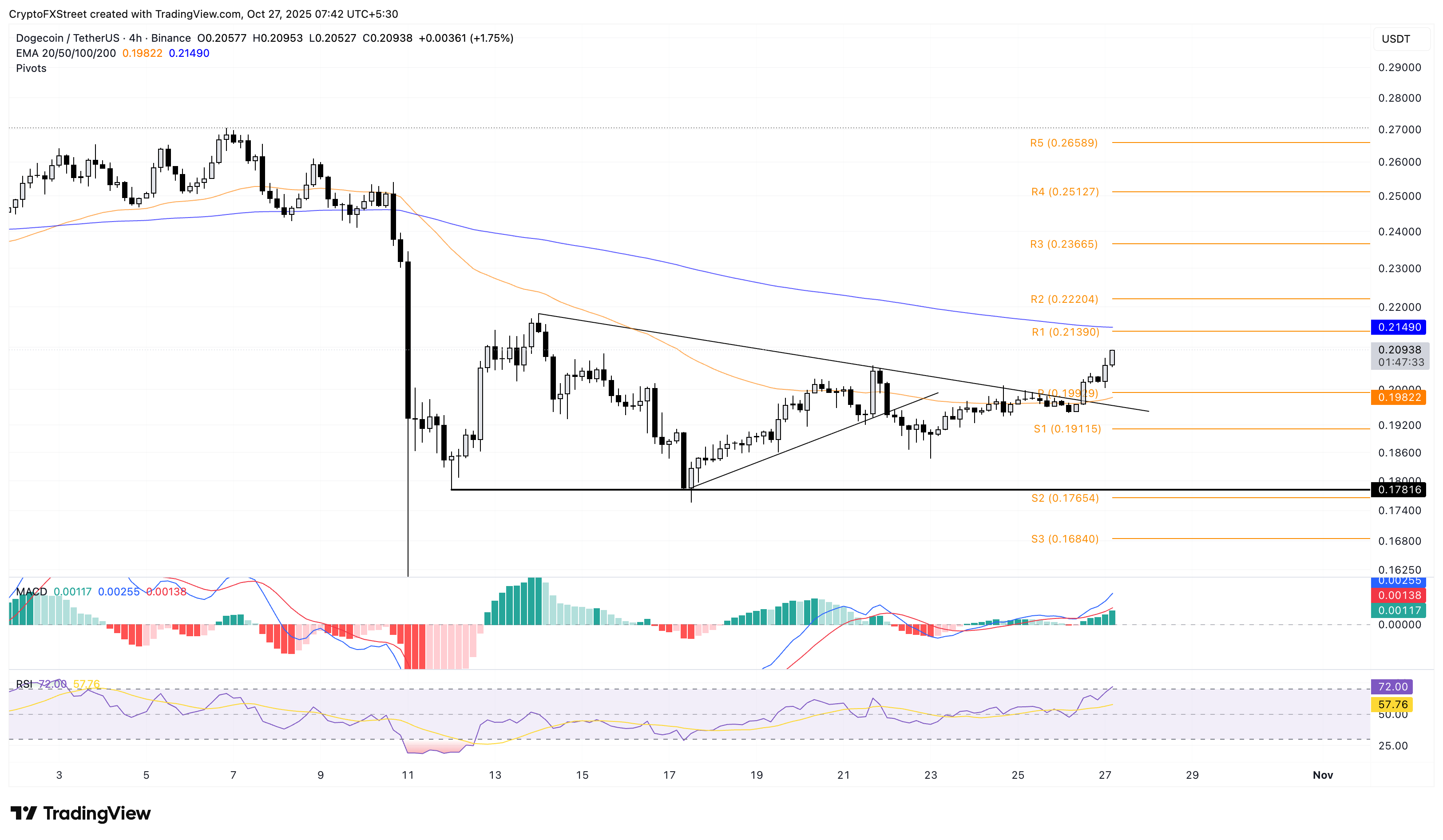 Đợt tăng giá đột phá của Dogecoin nhắm tới Đường trung bình động hàm mũ (EMA) 200 kỳ ở mức 0,21490 đô la, cao hơn một chút so với Điểm trục R1.