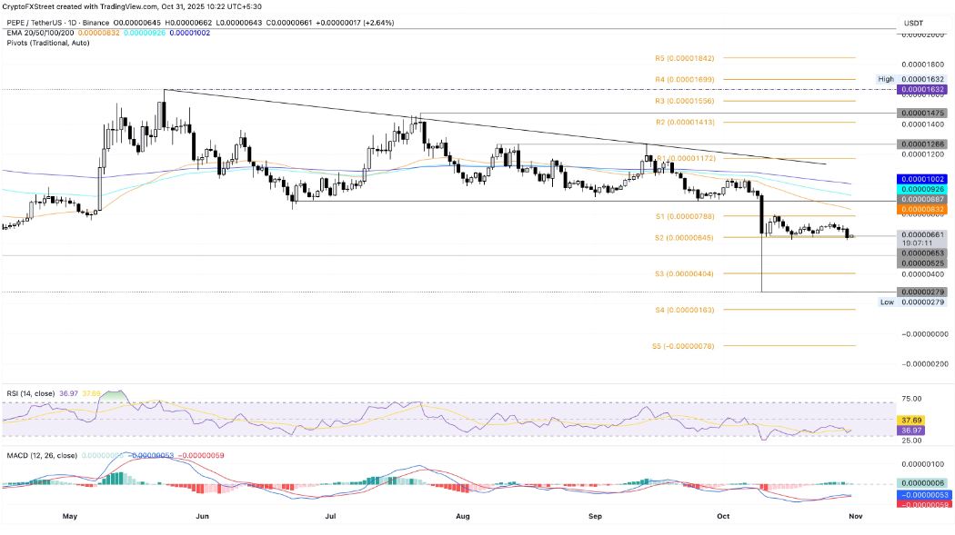 Pepe tăng 2% vào thời điểm viết bài hôm thứ Sáu, sau bốn nến giảm liên tiếp trên biểu đồ hàng ngày. Đồng tiền meme mang chủ đề ếch này hiện đang giữ ở mức giá 0,00000645 đô la tại Điểm xoay S2, mức giá đã tạo ra nhiều mức hỗ trợ và vẫn giữ nguyên kể từ ngày 11 tháng 10.