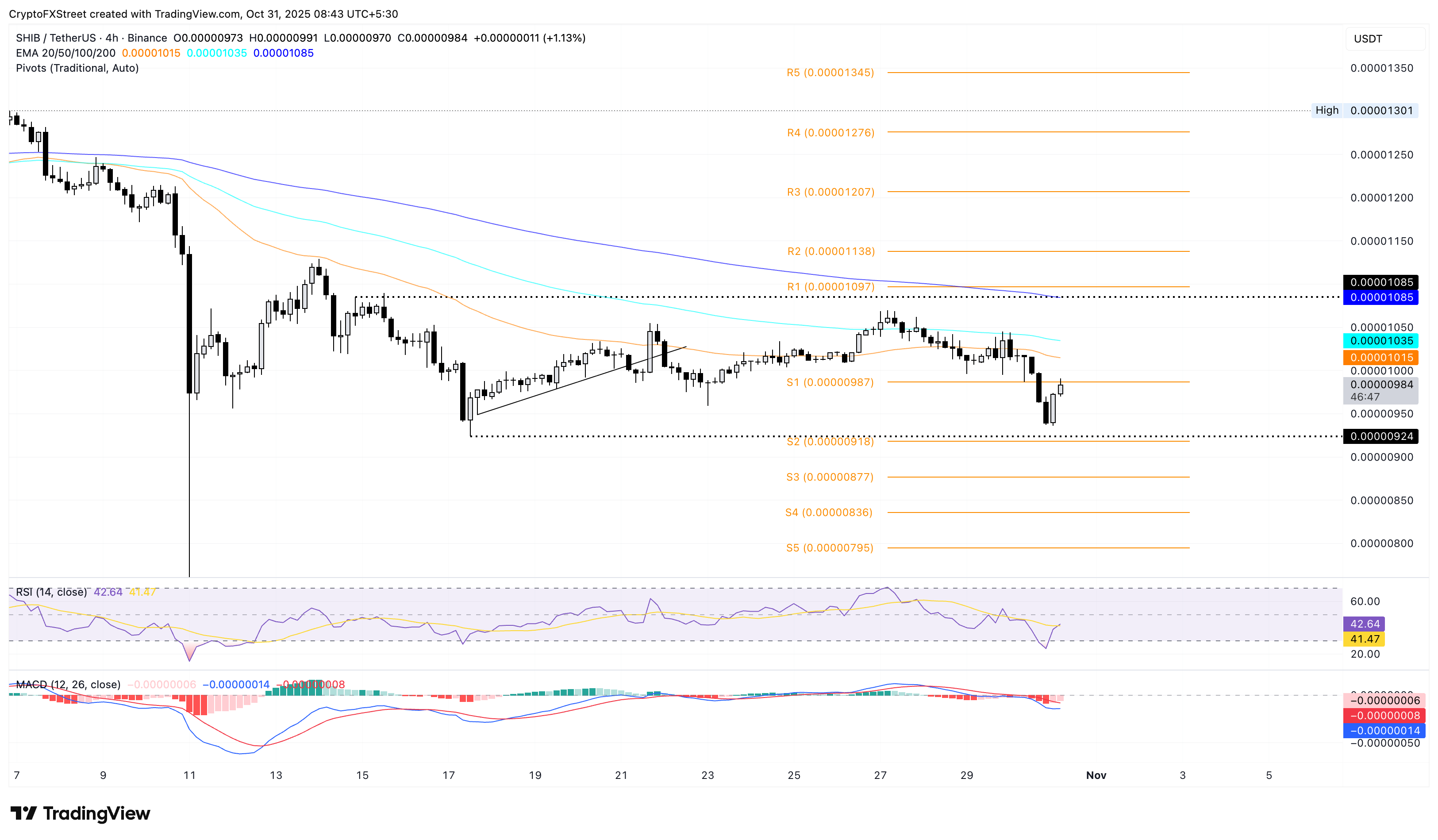 Đồng tiền meme này đang chật vật để vượt lên trên Điểm trục S1 ở mức 0,00000987 đô la sau khi bật trở lại từ mức gần 0,00000924 đô la, được đánh dấu bằng mức thấp nhất vào ngày 17 tháng 10.