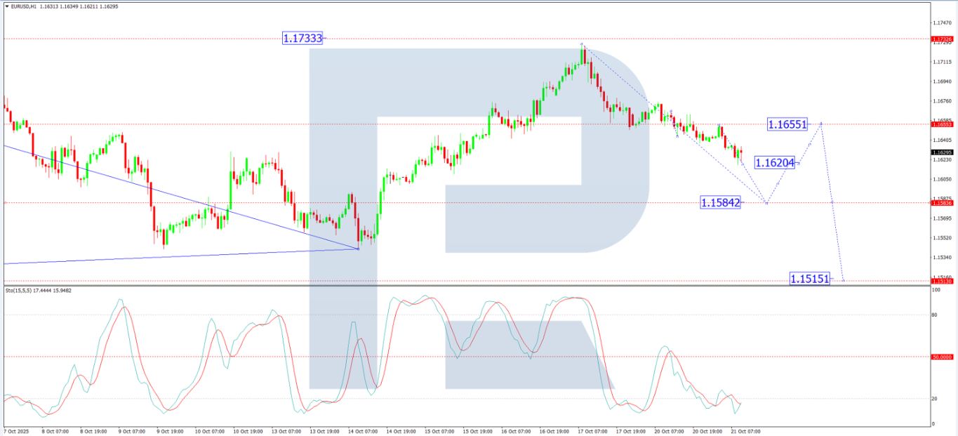 Biểu đồ H1 cho thấy cặp tiền tệ này đang phá vỡ xu hướng giảm từ một đợt tích lũy chặt chẽ quanh mức 1,1655. Động thái này báo hiệu khả năng hoàn tất một đợt điều chỉnh và bắt đầu một đợt giảm giá mới. Mục tiêu giảm ban đầu ít nhất là 1,1584. Quan điểm này được hỗ trợ bởi chỉ báo dao động Stochastic, với đường tín hiệu nằm dưới mức 50 và đang giữ gần mức 20, phản ánh đà giảm mạnh trong ngắn hạn.