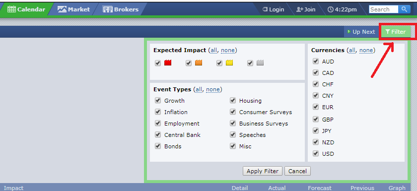Như bạn nhìn thấy ở trên, có rất nhiều các sự kiện được diễn ra trong 1 ngày, trong số này không phải sự kiện nào bạn cũng cần quan tâm hay phục vụ cho việc giao dịch forex mỗi ngày, việc của bạn là chỉ quan tâm đến những tin tức quan trọng tránh bị nhiễu. Vì lẽ đó, bạn nên loại bộ bớt các thông tin không cần thiết bằng cách sử dụng bộ lọc do ForexFactory cung cấp. Để lọc tin, các bạn có thể làm theo cách hướng dẫn sau đây của chúng tôi.