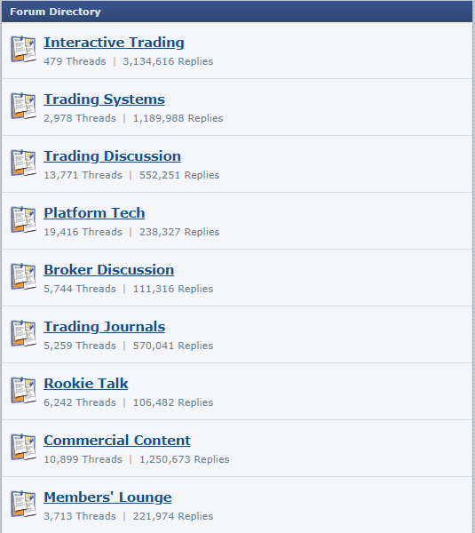 ForexFactory Forums là nơi các nhà giao dịch hợp tác, tranh luận và trao đổi ý tưởng với nhau về giao dịch với số lượng bài đăng được xem là lớn hơn bất kỳ diễn đàn tài chính nào khác trên thế giới, và một phần lớn trong số đó là các bài đăng chất lượng cao từ các nhà giao dịch giàu kinh nghiệm.