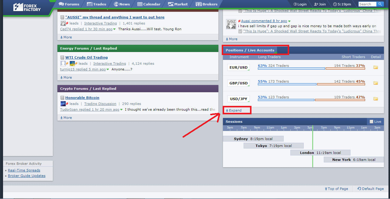 Trên trang chủ của ForexFactory còn có Sentiment Indicator – 1 tool thống kê có bao nhiêu phần trăm Trader vào lệnh long/short trên thị trường. Muốn xem chúng bạn kéo xuống dưới cùng của website sẽ nhìn thấy: