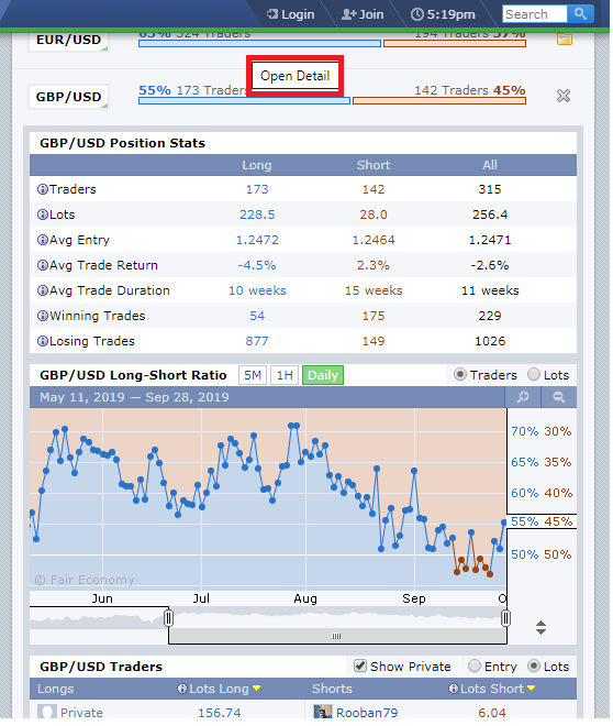 Muốn xem nhiều cặp tiền tệ hơn bạn nhấn vào dòng Expand. Nếu muốn xem chi tiết như có bao nhiêu trader giao dịch cặp tiền tệ này, đánh với số lot là bao nhiêu bạn chỉ cần nhấn chuột vào cặp tiền đó sẽ hiện ra đầy đủ thông tin như bên dưới:
