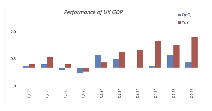 GDP của Vương quốc Anh tăng 1,3% so với cùng kỳ năm trước (YoY) trong quý 2 năm 2025 so với mức dự kiến là 1,4% và mức 1,4% trong quý 2.
