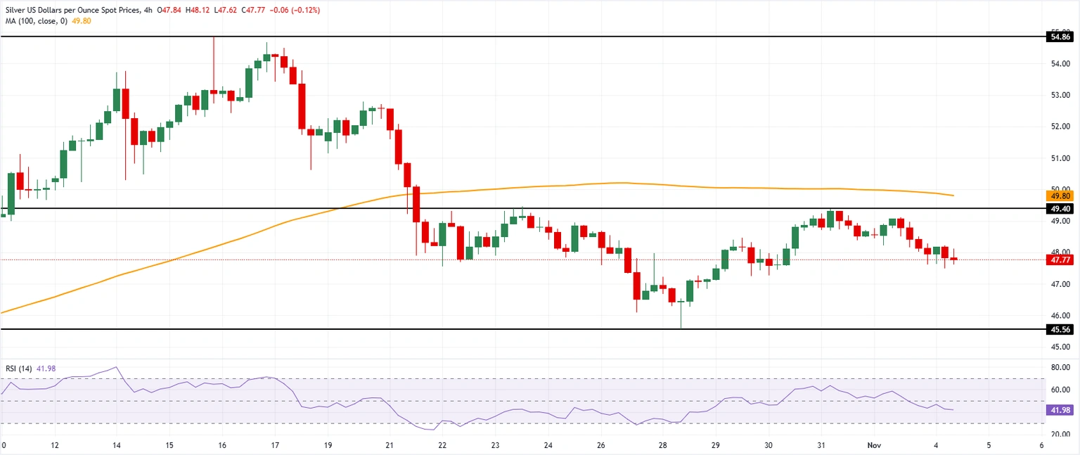 Giá bạc (XAG/USD) giảm vào thứ Ba xuống còn khoảng 47,70 đô la một ounce, giảm 1,10% trong ngày, sau khi cố gắng kéo dài đà tăng gần đây vượt qua mức 49,50 đô la.