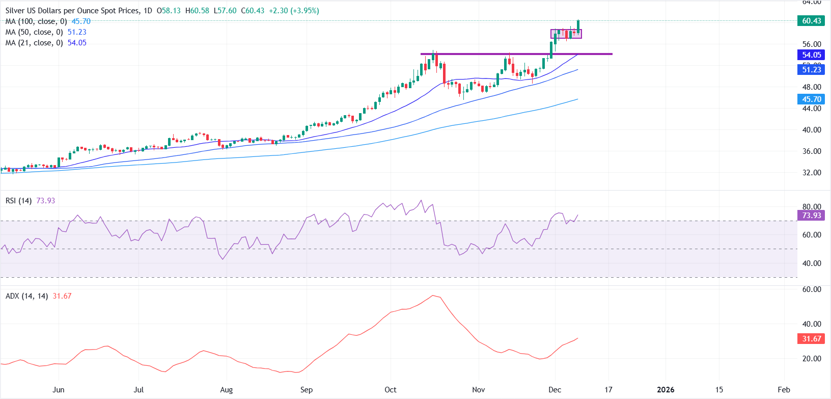 Giá bạc (XAG/USD) tiếp tục đà tăng lịch sử vào thứ Ba, lần đầu tiên vượt mốc 60 đô la khi đà tăng giá tăng tốc trước thềm quyết định lãi suất của Cục Dự trữ Liên bang (Fed). Kim loại này đã tăng hơn 100% từ đầu năm đến nay, được hỗ trợ bởi sự thay đổi nhẹ trong kỳ vọng lãi suất của Fed, điều kiện nguồn cung vật chất thắt chặt và nhu cầu mạnh mẽ từ cả người dùng công nghiệp và nhà đầu tư.