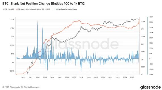 Theo dữ liệu của Glassnode, các nhà đầu tư nhỏ lẻ (những người nắm giữ từ 100 đến 1000 BTC) đã tăng lượng BTC nắm giữ của họ thêm 54.000 BTC trong 7 ngày qua. Tổng lượng BTC mà các nhà đầu tư này nắm giữ đã tăng từ 3,521 triệu BTC lên 3,575 triệu BTC, đánh dấu sự tích lũy mạnh mẽ nhất kể từ năm 2012, cho thấy niềm tin lạc quan mạnh mẽ của nhóm này bất chấp việc BTC giảm 30%. Tuy nhiên, điều này có thể chưa đủ để đẩy giá BTC lên cao hơn, vì áp lực bán ra từ các tổ chức và cá voi vẫn tiếp tục.