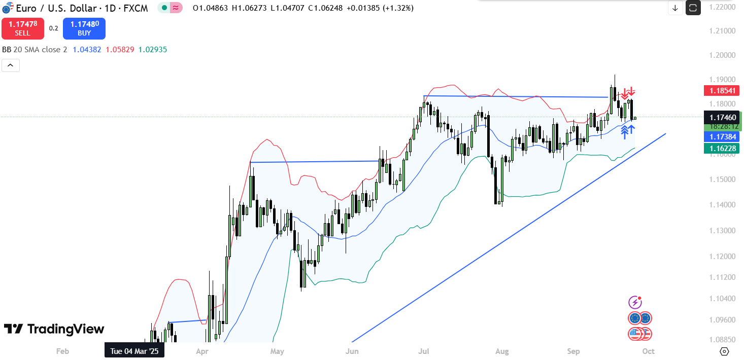 Giá EUR/USD hôm nay 25/09 đang trong giai đoạn điều chỉnh sau nhịp tăng, dao động quanh 1.174.