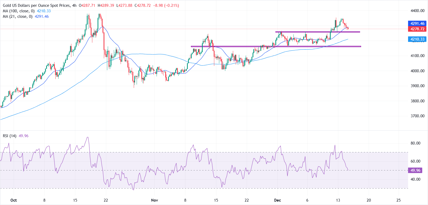 Phân tích kỹ thuật: XAU/USD nhắm đến mức hỗ trợ $4,250 sau khi không vượt qua được mức $4,350.