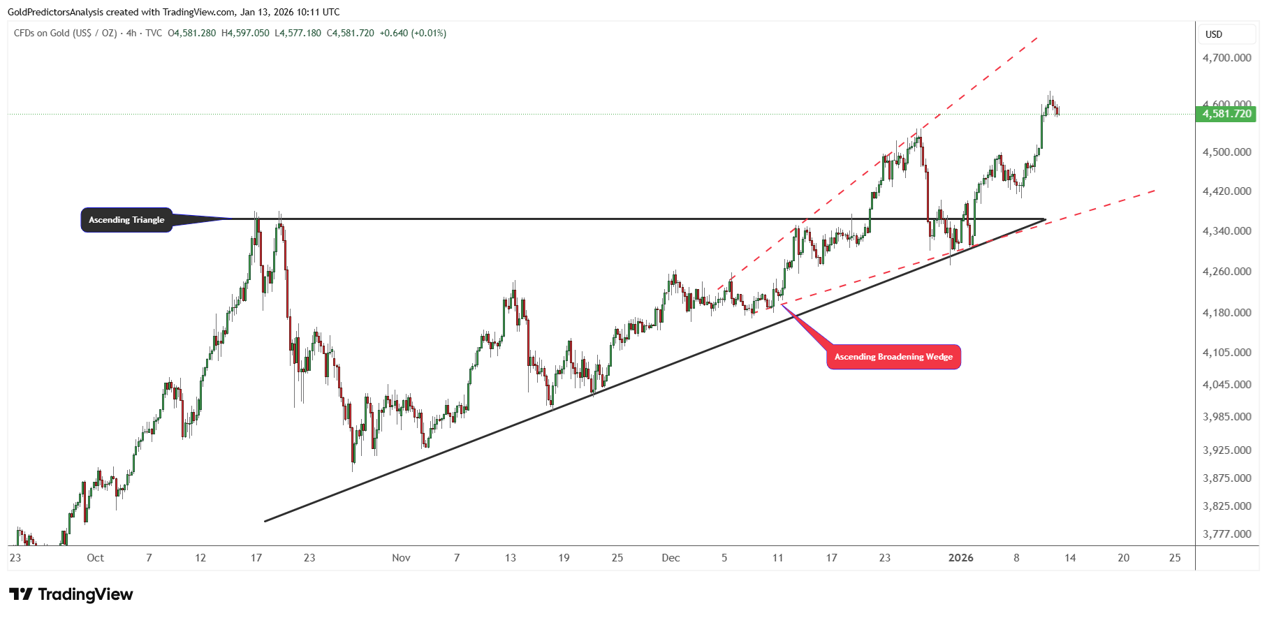 Biểu đồ giá vàng bên dưới cho thấy nền tảng kỹ thuật vững chắc, với mô hình tam giác tăng dần ban đầu dẫn đến mô hình nêm mở rộng tăng dần. Sự phá vỡ đầu tiên xảy ra bên trong tam giác, nơi giá liên tục tạo áp lực giữa mức hỗ trợ tăng và mức kháng cự ngang. Khi giá vàng đóng cửa trên ranh giới trên, nó báo hiệu sự chuyển dịch từ giai đoạn tích lũy sang giai đoạn tăng tốc.