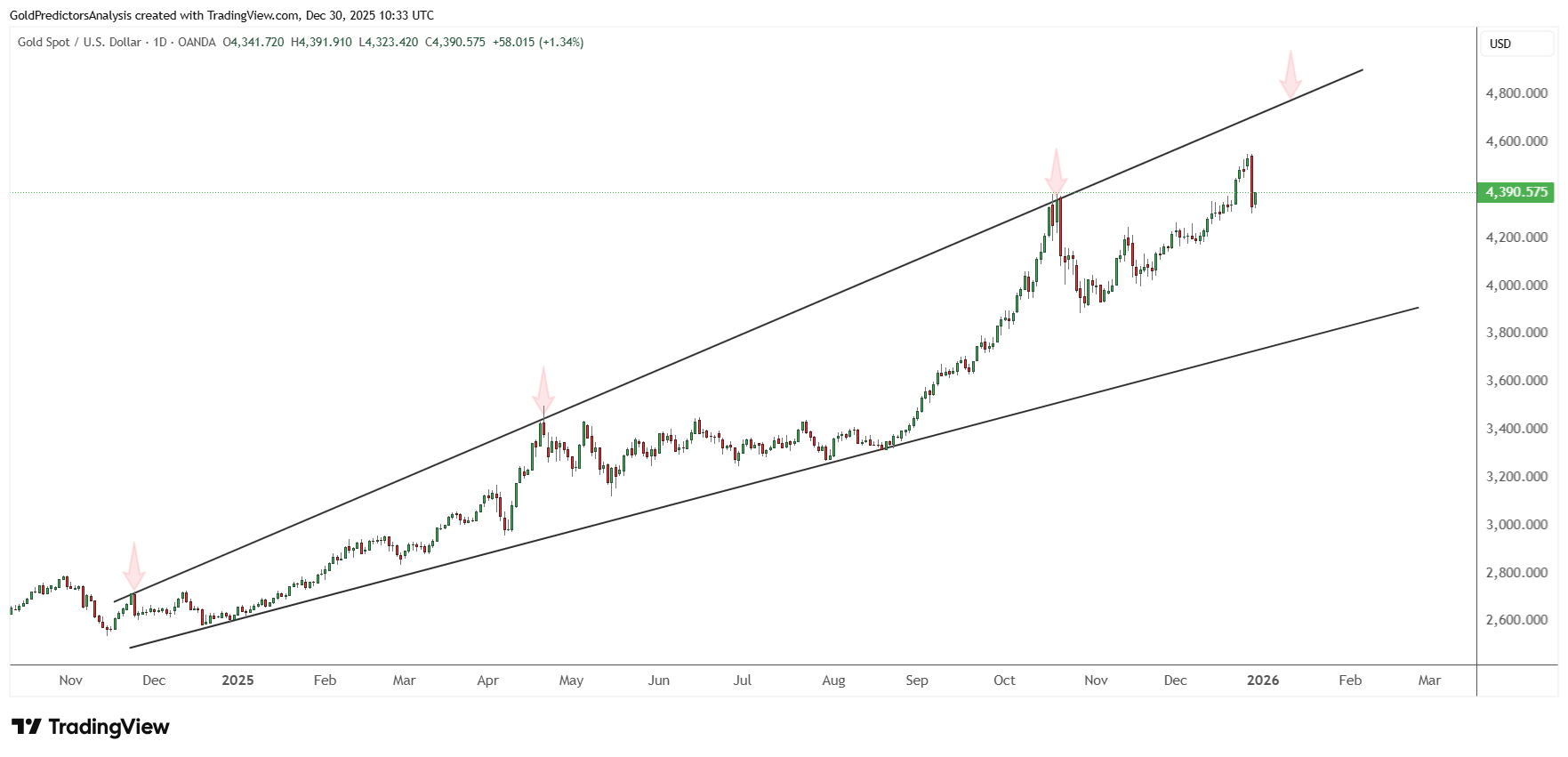 Mỗi lần giá bị từ chối ở ranh giới trên trước đó đều kích hoạt các đợt điều chỉnh ngắn hạn, sau đó là đà tăng trở lại. Đợt điều chỉnh hiện tại cũng theo mô hình tương tự. Chừng nào giá vẫn nằm trong mô hình nêm, xu hướng tăng tổng thể vẫn được duy trì. Ranh giới dưới đang tăng dần tạo ra vùng hỗ trợ quan trọng gần mức 4.000 đô la. Việc phá vỡ xuống dưới mức này có thể cho thấy sự tích lũy sâu hơn, nhưng hiện tại, xu hướng vẫn là đi lên.