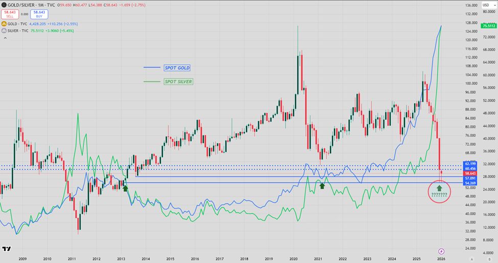 - Trong lịch sử, tỷ lệ ở mức 60 hoặc thấp hơn thường báo hiệu sự sụt giảm mạnh của cả giá vàng và bạc.