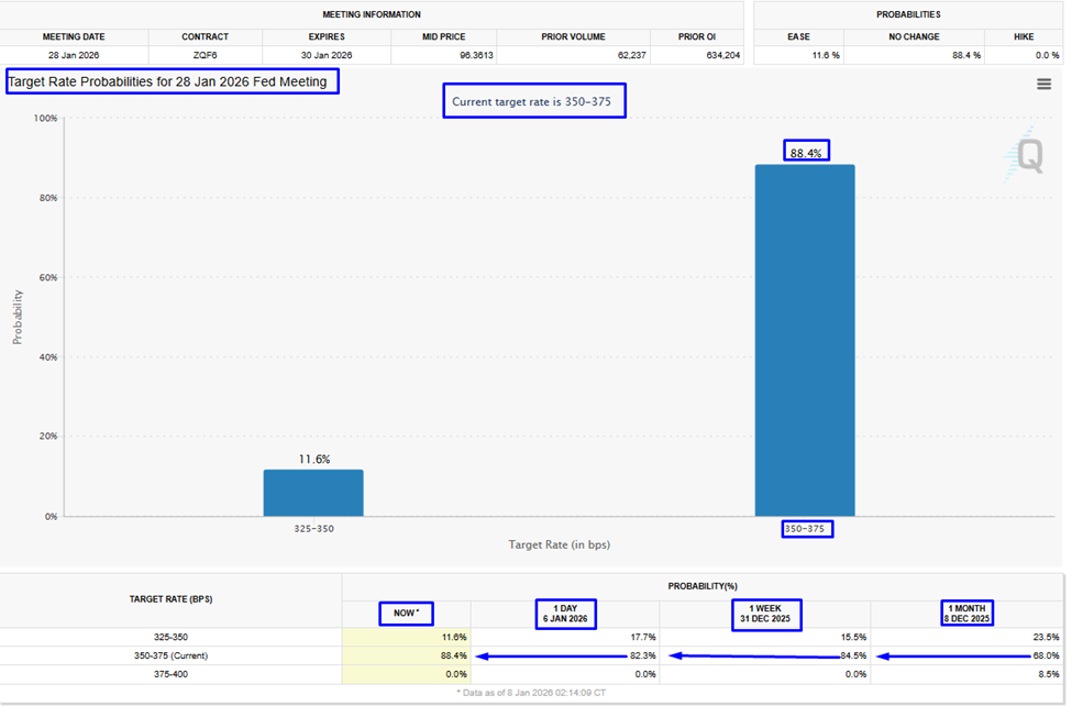 - Theo chỉ số CME FedWatch, xác suất không thay đổi lãi suất trong tháng 1 đã tăng lên 88,4% vào hôm nay, so với mức 68% vào ngày 8 tháng 12 năm 2025.