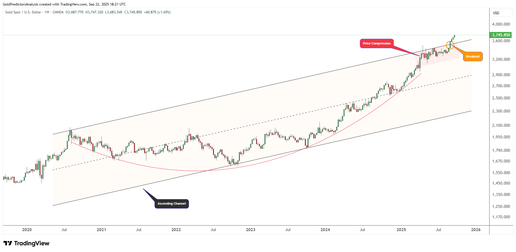 Biểu đồ vàng bên dưới cho thấy một thiết lập đột phá kinh điển trong một kênh tăng dần được xác định rõ ràng. Kể từ năm 2020, vàng đã tăng đều đặn, liên tục tìm thấy ngưỡng hỗ trợ tại đường xu hướng dưới. Hành vi nhất quán này đã củng cố khả năng kiểm soát đà tăng trong toàn bộ cấu trúc. Trong khi đó, đường xu hướng trên liên tục đóng vai trò kháng cự, từ chối nhiều nỗ lực tăng giá và kích hoạt các đợt đảo chiều đáng chú ý theo thời gian.