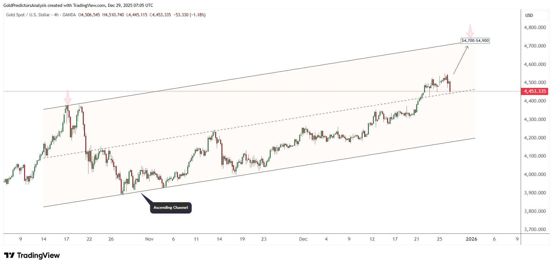 Sự tích lũy hiện tại gần các đỉnh gần đây dường như chỉ là tạm dừng chứ không phải là sự đảo chiều. Mức kháng cự tiếp theo nằm giữa 4.700 USD và 4.900 USD, gần ranh giới trên của kênh giá. Nếu vàng duy trì được sức mạnh trên mức 4.400 USD, con đường hướng tới vùng giá trên này vẫn còn rộng mở. Một sự bứt phá mạnh mẽ vượt qua vùng này sẽ mở ra cơ hội tăng giá hơn nữa vào đầu năm 2026.