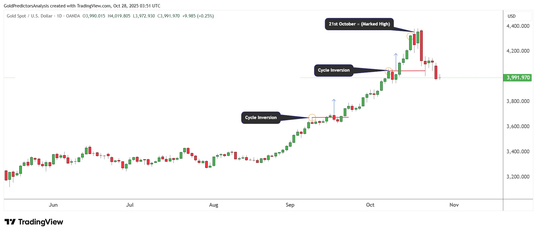 Biểu đồ dưới đây cho thấy cách giao dịch theo chu kỳ có thể xác định điểm vào và ra lý tưởng trên thị trường vàng. Gold Predictors dự báo một mức đỉnh đáng kể vào ngày 21 tháng 10 (±72 giờ), sau hai lần đảo ngược chu kỳ rõ ràng trước đó trong đợt tăng giá. Mỗi lần đảo ngược đều đánh dấu một tín hiệu tiếp tục mạnh mẽ, và lần thứ hai xác nhận đà tăng giá hướng đến ngưỡng cao dự kiến.
