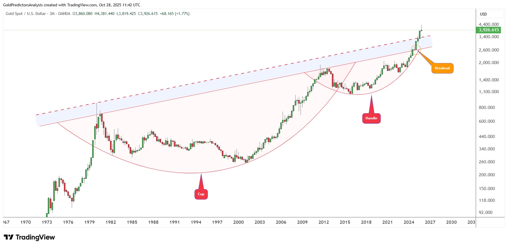 Vàng phá vỡ mô hình cốc và tay cầm kéo dài nhiều thập kỷ, xác nhận xu hướng tăng giá dài hạn