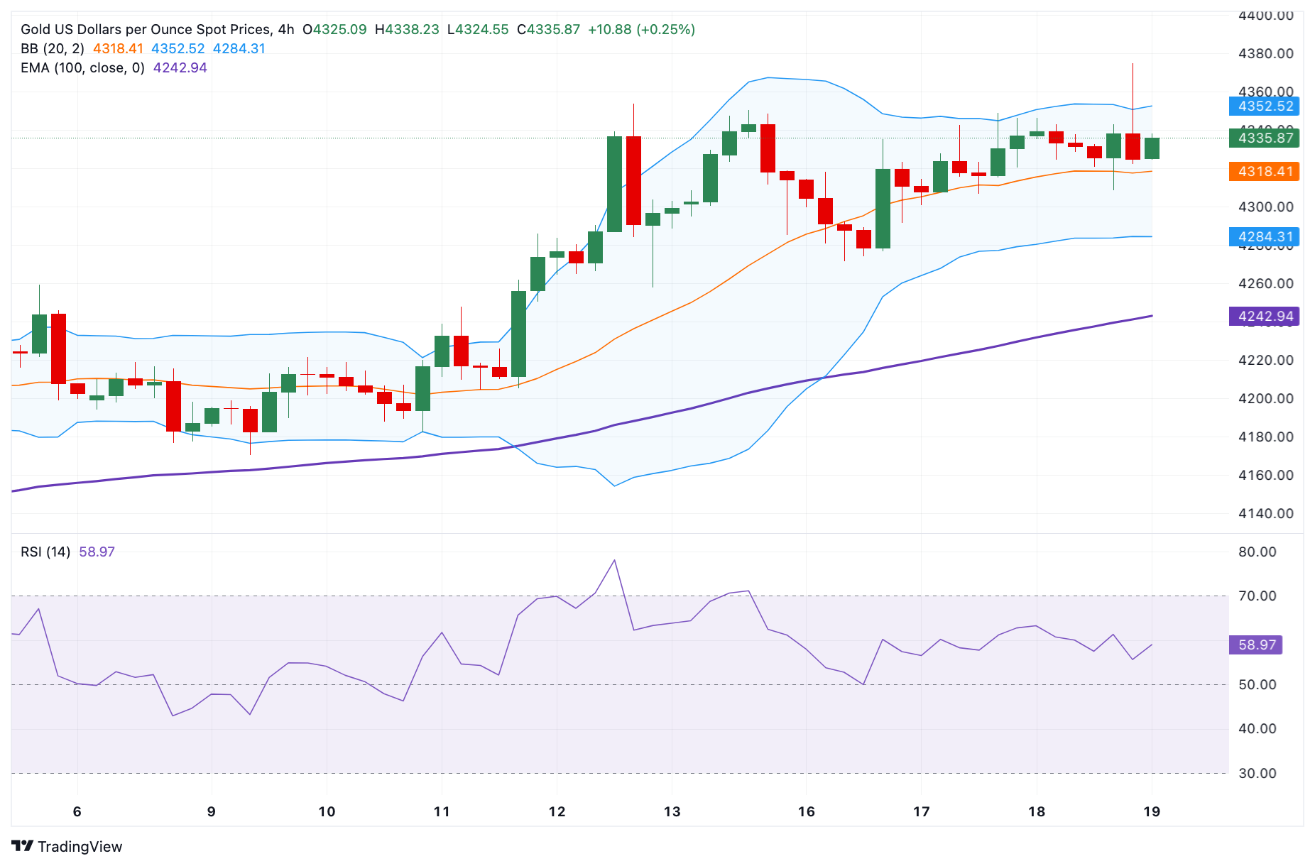 Rào cản tăng giá đầu tiên đối với XAU/USD xuất hiện ở ranh giới trên của dải Bollinger Band ở mức 4.352 đô la. Một sự phá vỡ dứt khoát trên mức này có thể cho thấy người mua đã sẵn sàng tham gia và duy trì đà tăng trở lại mức cao nhất mọi thời đại là 4.381 đô la, trên đường hướng tới mốc tâm lý 4.400 đô la.