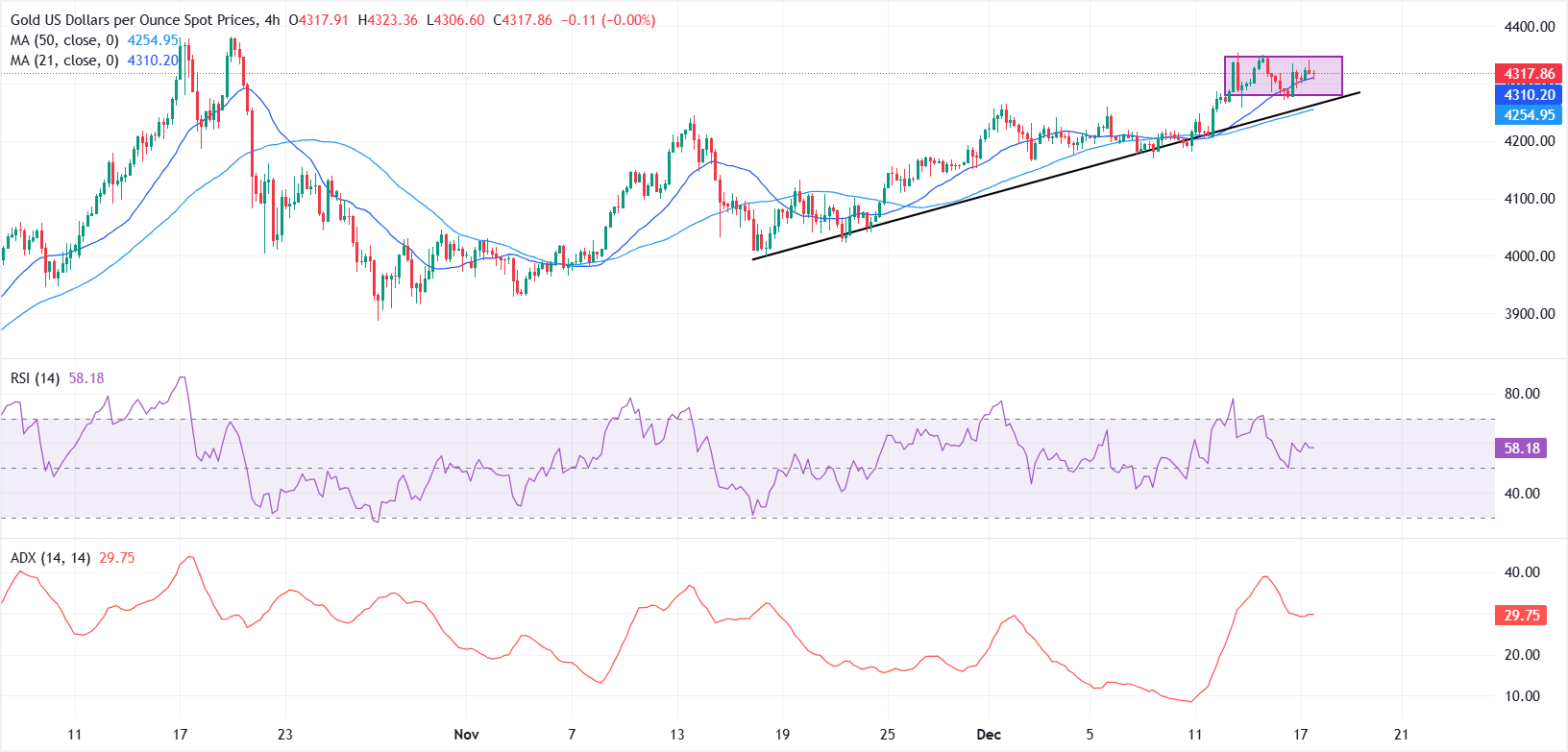 Trên biểu đồ 4 giờ, XAU/USD tiếp tục giao dịch trong một cấu trúc tăng dần, được hỗ trợ bởi đường xu hướng tăng vẽ từ mức thấp giữa tháng 11 gần 4.000 đô la.