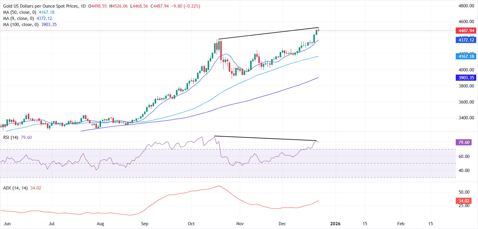 Giá vàng (XAU/USD) ổn định trong ngày thứ Tư, sau khi tăng vọt lên mức cao kỷ lục mới gần 4.526 USD vào đầu ngày. Biến động gia tăng trong phiên giao dịch châu Á do thanh khoản thấp trong kỳ nghỉ lễ Giáng sinh