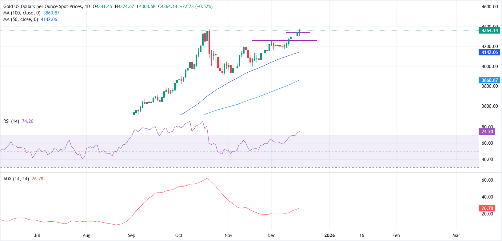- Về mặt kỹ thuật, XAU/USD đang có đà tăng mạnh khi vượt qua mốc $4,350, và phe mua hiện đang nhắm đến đỉnh $4,381.