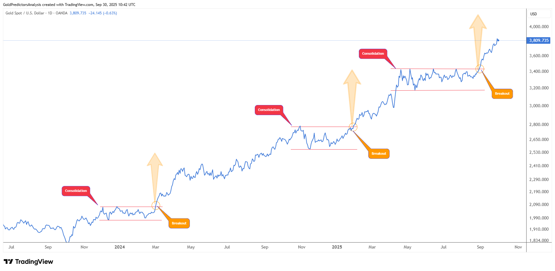 Biểu đồ vàng bên dưới cho thấy một loạt các giai đoạn củng cố, tiếp theo là các đợt phá vỡ quyết định. Mỗi đợt phá vỡ đều kích hoạt một đợt tăng giá mạnh mẽ, thiết lập các mức hỗ trợ cao hơn. Hơn nữa, biểu đồ còn làm nổi bật ba chu kỳ riêng biệt. Trong mỗi trường hợp, giá được củng cố trong một dải ngang, và khi ngưỡng kháng cự bị phá vỡ, động lượng tăng vọt. Nhìn chung, mô hình này cho thấy nhu cầu tăng đều đặn, thúc đẩy mỗi đợt phá vỡ.