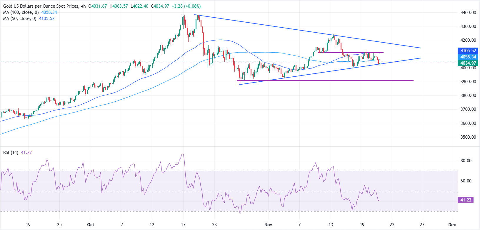 Trên biểu đồ 4 giờ, XAU/USD vẫn chịu áp lực, với giá giao dịch dưới đường trung bình động đơn giản (SMA) 50 kỳ, khiến xu hướng ngắn hạn nghiêng về phe bán. Đường SMA 50 kỳ quanh mức 4.105,62 đô la đã bắt đầu đảo chiều, báo hiệu đà tăng đang yếu đi, trong khi vẫn nằm ngay trên đường SMA 100 kỳ đang tăng nhẹ gần mức 4.058,39 đô la.