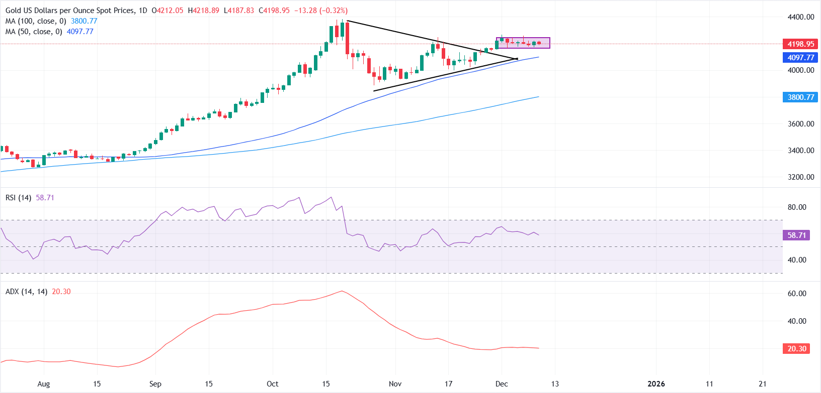 Giá vàng vẫn đang dao động trong khoảng từ 4.150 USD đến 4.250 USD sau khi phá vỡ mô hình tam giác đối xứng, phản ánh sự lưỡng lự rõ ràng của các nhà giao dịch trước quyết định của Cục Dự trữ Liên bang (Fed) .
