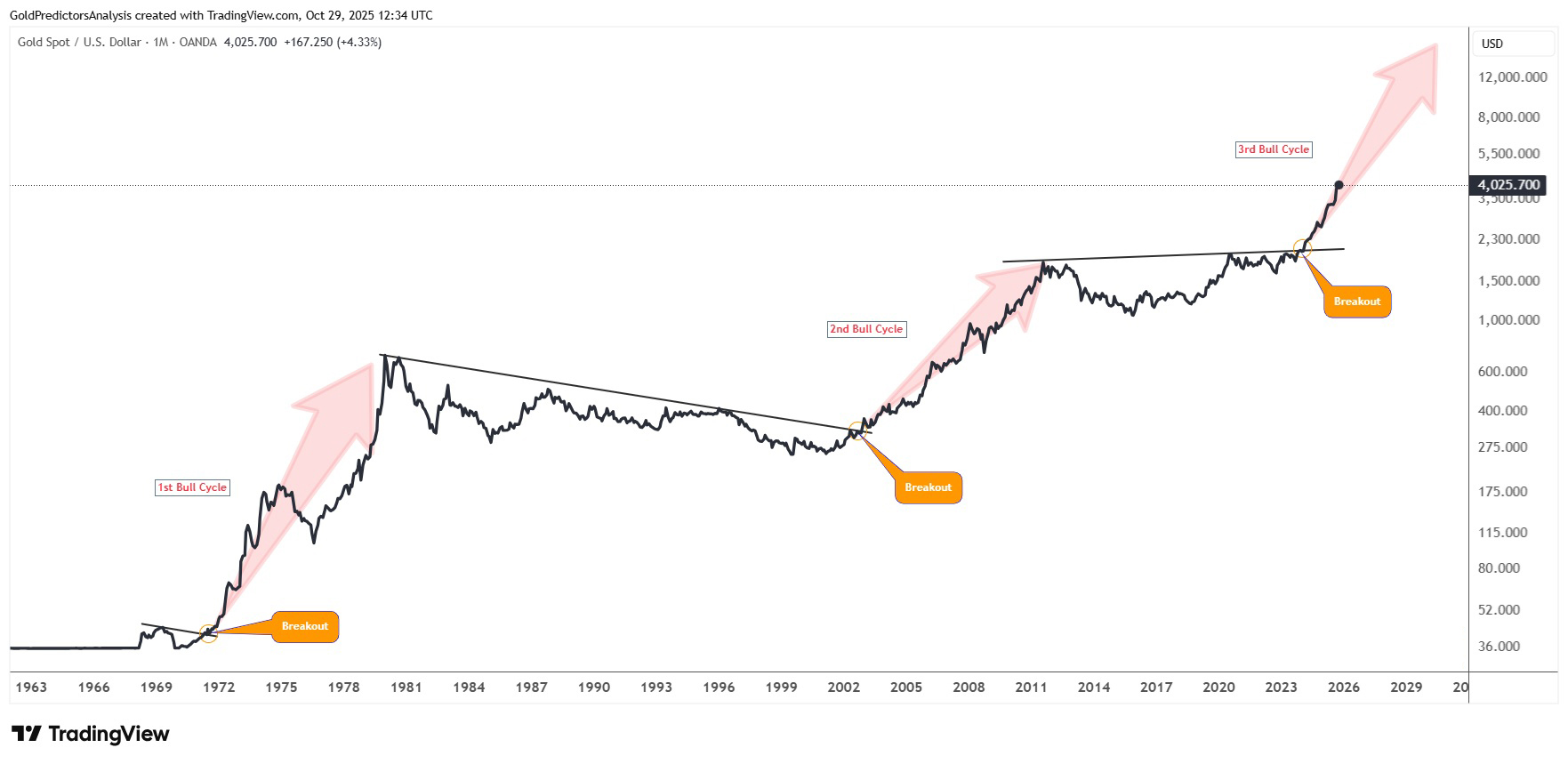 Đáng chú ý, chu kỳ hiện tại bắt đầu vào năm 2024, sau khi vượt qua vùng kháng cự dài hạn đã được thiết lập vững chắc. Sự bứt phá này đã xác nhận sự hoàn thành của mô hình cốc-tay cầm kéo dài nhiều thập kỷ, một mô hình hiếm gặp và có ý nghĩa về mặt cấu trúc. Động thái này phản ánh các thị trường tăng giá lịch sử, nơi những đợt bứt phá sớm dẫn đến các xu hướng tăng mạnh mẽ và lâu dài. Với đà tăng tốc và các mô hình lịch sử đang dần hội tụ, bối cảnh hiện tại cho thấy vàng đang ở giai đoạn đầu của chu kỳ tăng giá lớn thứ ba.
