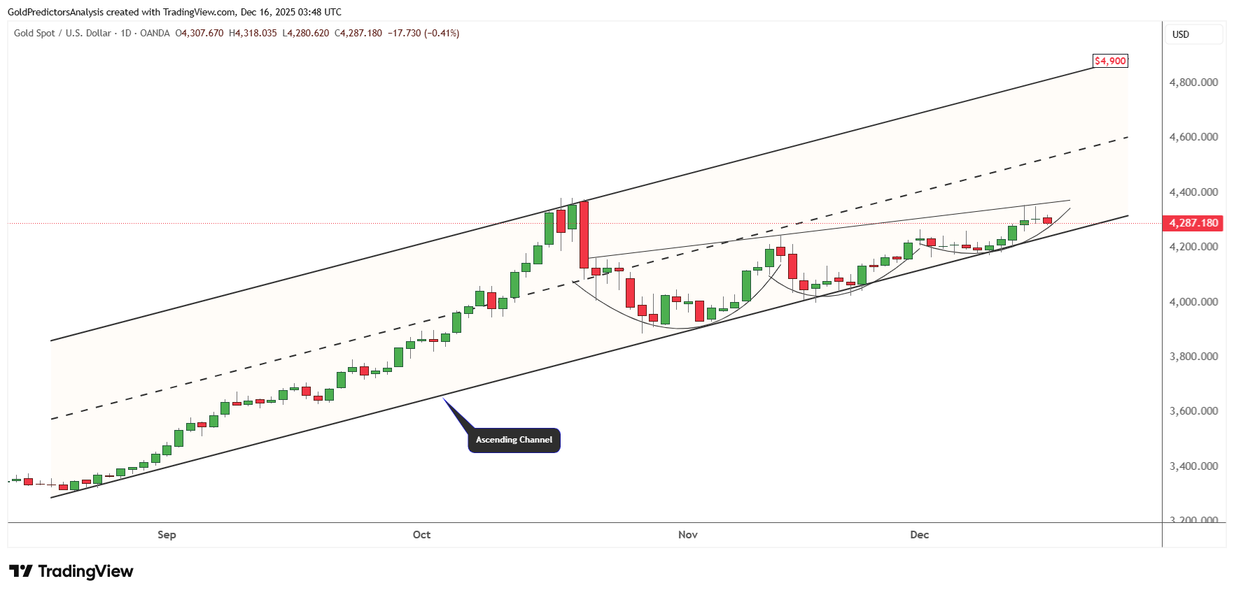 Hiện tại, giá vàng đang giao dịch trong mô hình đáy tròn thứ ba và đang tiến gần đến ngưỡng kháng cự quan trọng ở đường viền cổ. Một sự phá vỡ trên mức này sẽ cho thấy đà tăng giá mới và xác nhận sự tiếp tục của xu hướng tăng rộng hơn. Triển vọng kỹ thuật vẫn thuận lợi miễn là giá giữ vững trên mức hỗ trợ gần 4.100 đô la. Một sự phá vỡ được xác nhận trên vùng giá từ 4.350 đến 4.400 đô la có thể sẽ mở đường hướng tới vùng 4.900 đô la.