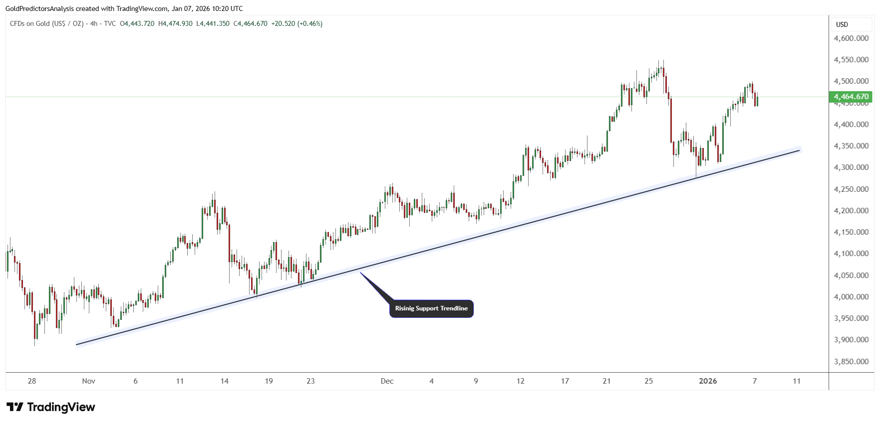 Biểu đồ vàng bên dưới cho thấy một đường xu hướng hỗ trợ tăng dần được xác định rõ ràng, đã định hướng diễn biến giá kể từ đầu tháng 11. Mỗi đợt điều chỉnh lớn đều tìm thấy sự hỗ trợ dọc theo đường tăng này, khẳng định vai trò của nó như một nền tảng kỹ thuật quan trọng. Gần đây nhất, vàng đã bật tăng mạnh từ mức này, xác nhận sức mạnh của mức hỗ trợ cấu trúc này.