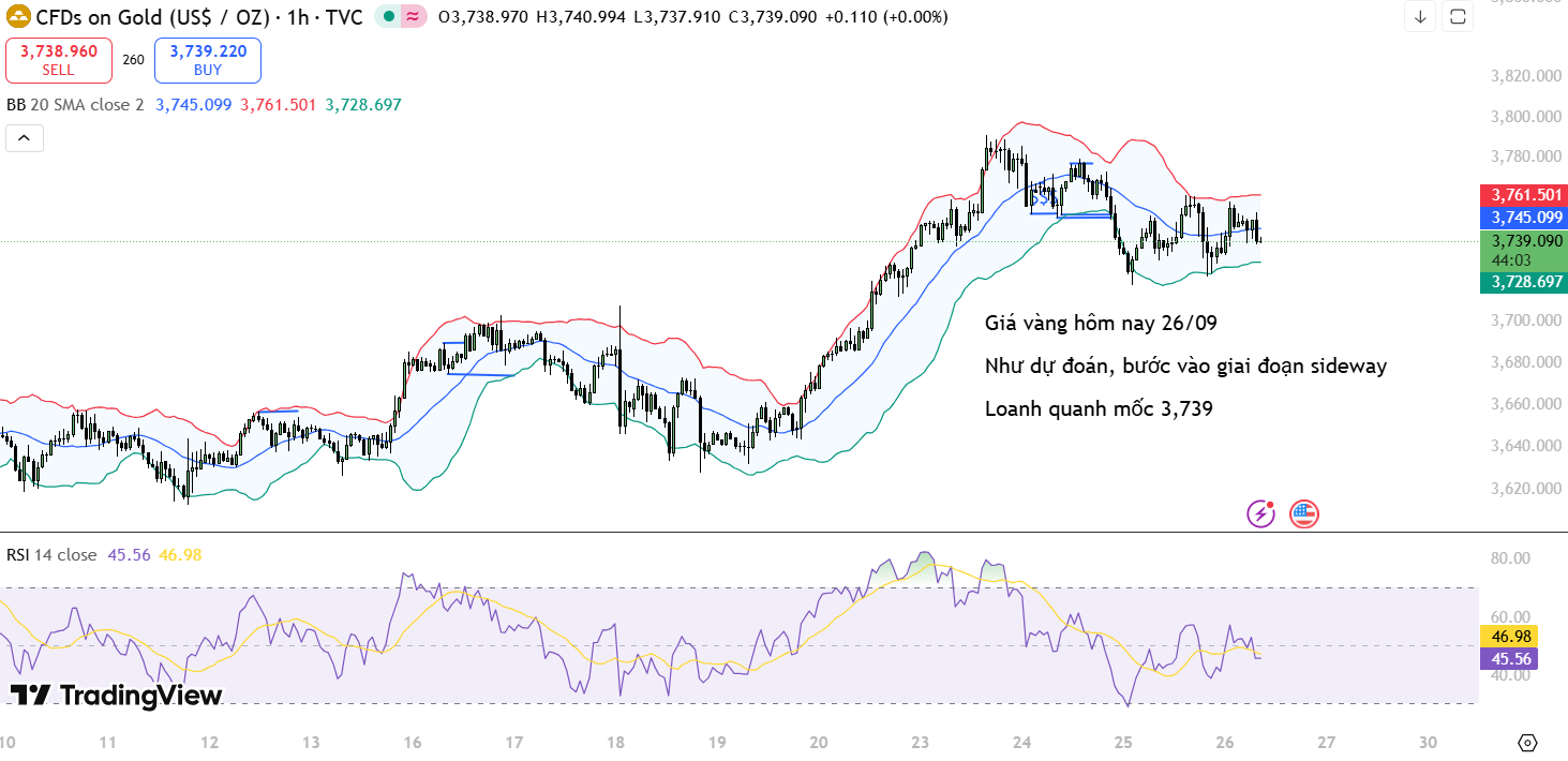Giá vàng hôm nay 26/09 đi ngang quanh 3,739 USD/oz, bước vào giai đoạn sideway với tín hiệu giao dịch trong biên độ.