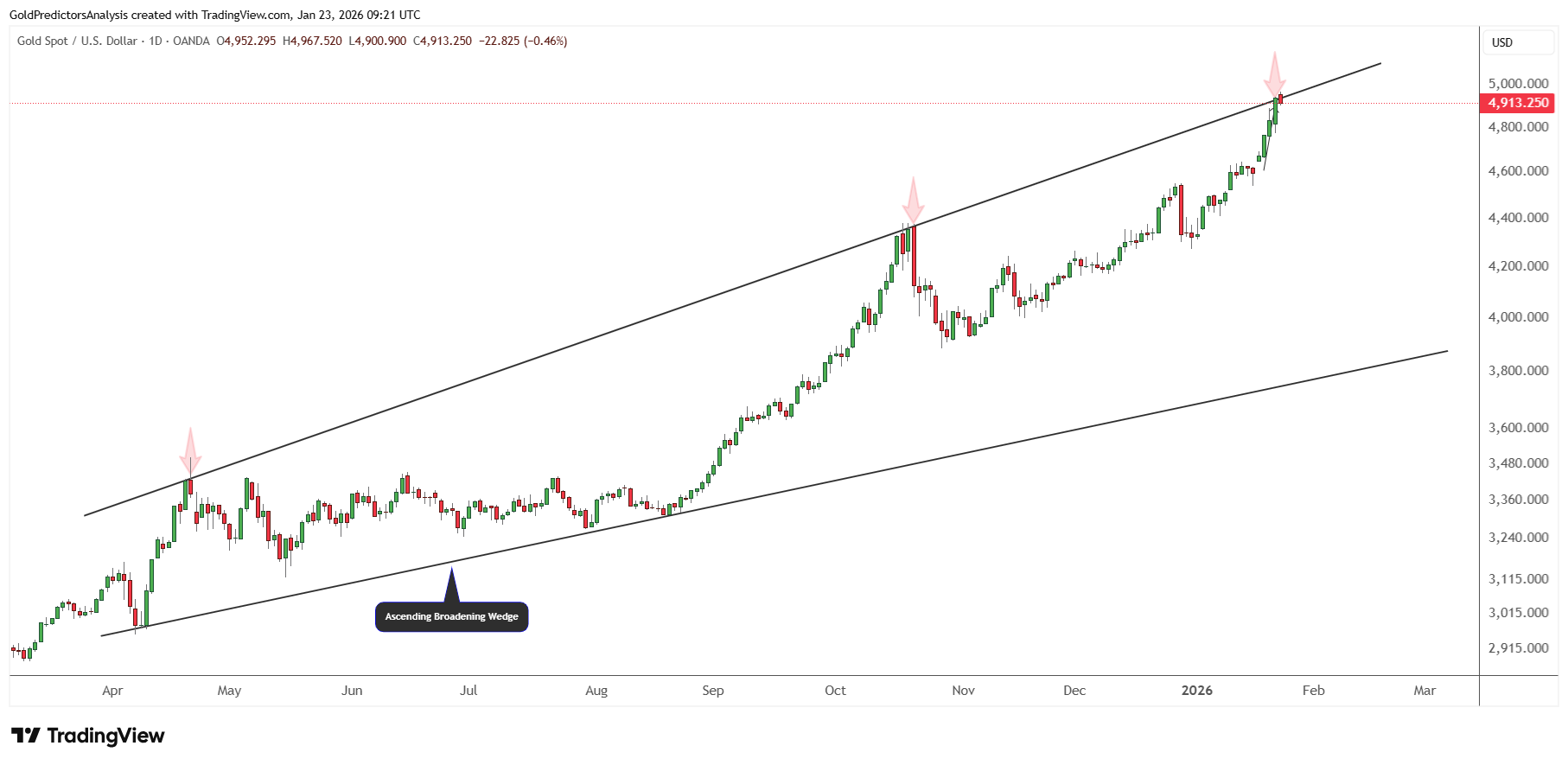 Biểu đồ vàng bên dưới cho thấy giá đang di chuyển trong một mô hình nêm mở rộng tăng dần được xác định rõ ràng. Mô hình này phản ánh sự biến động ngày càng tăng và biên độ dao động giá mở rộng, với cả đường hỗ trợ và kháng cự đều phân kỳ. Sau khi củng cố gần ranh giới dưới vào đầu năm 2025, vàng bắt đầu một đợt tăng giá ổn định và mạnh mẽ hơn vào cuối năm. Mỗi đợt tăng giá đều dựa trên những mức tăng trước đó, với những đợt điều chỉnh nhẹ và đà tăng trưởng mạnh mẽ.