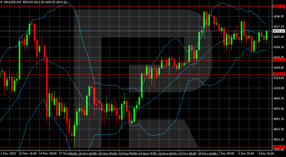 Trên biểu đồ H4, vàng (XAU/USD) đang củng cố sau đợt tăng giá gần đây lên 4.220–4.230 USD. Giá vẫn nằm trên dải Bollinger giữa, với dải trên hướng lên trên một chút, cho thấy nỗ lực phục hồi sau đợt suy yếu gần đây.