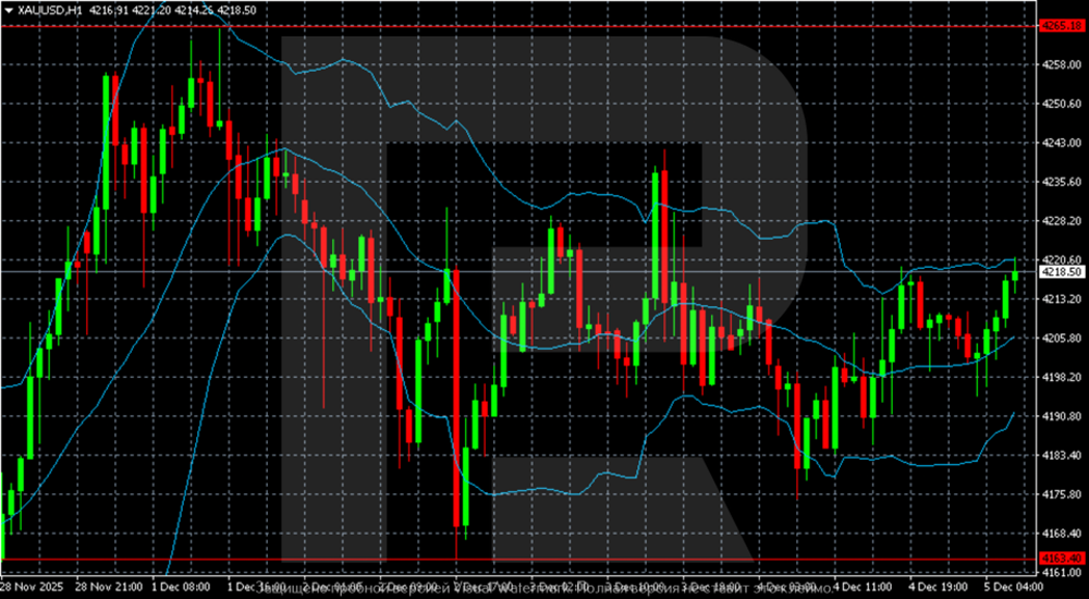 Trên biểu đồ H1, XAU/USD đang giao dịch trong phạm vi hẹp giữa 4.188 USD và 4.220 USD, phản ánh động lượng ngắn hạn hỗn hợp. Dải Bollinger giữa đang tạo ra trạng thái cân bằng ngắn hạn, xác nhận sự vắng mặt của xu hướng rõ ràng.